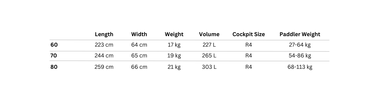 Size guides are only designed to give a basic indication of the best fit. It is always worth your while sitting in a kayak and taking it for a spin on the water to ensure the fit is correct for your body size and paddling style.
